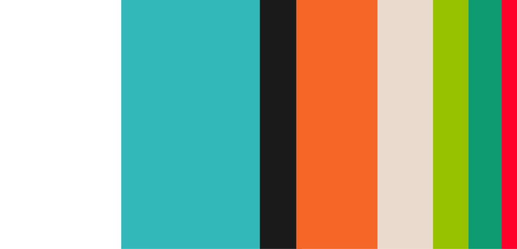 Die Grafik zeigt die gewünschte Farbwahrnehmung und -nutzung. Neben weißen Flächen, stellt Türkis die wichtigste Farbe im Farbangebot dar. Sie soll in der Gestaltung mit Farbflächen an erster Stelle stehen. Alle anderen Farben ordnen sich in der Hierarchie dieser Farbe unter und sollten möglichst dezent und selten eingesetzt werden.