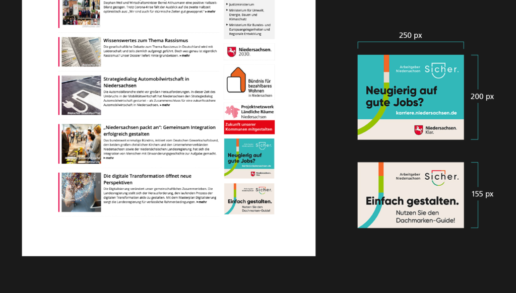 Diese beispielhaften Banner haben eine Breite von 250 Pixeln. Sie verlinken zum Karriereportal bzw. zum Dachmarken-Guide. Sie stehen als Download zur Verfügung und können genutzt werden, um sie auf den gewünschten Webseiten selbst einzubinden.