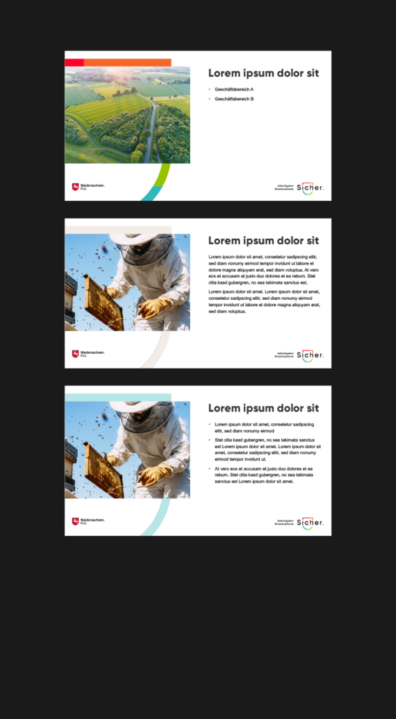 Nutzen Sie für Ihre Präsentationen einfach die Mastervorlage. Um es für Sie einfach zu gestalten, sind die hier abgebildeten Seiten bereits als Masterfolien angelegt. Wählen Sie einfach Ihre gewünschte Seite aus und befüllen Sie sie mit eigenen Bildern, Texten und Grafiken. Weitere Masterfolienvorlagen finden Sie in der Powerpoint-Datei, wenn Sie eine neue Folie via des nach unten zeigenden Pfeils hinzufügen.