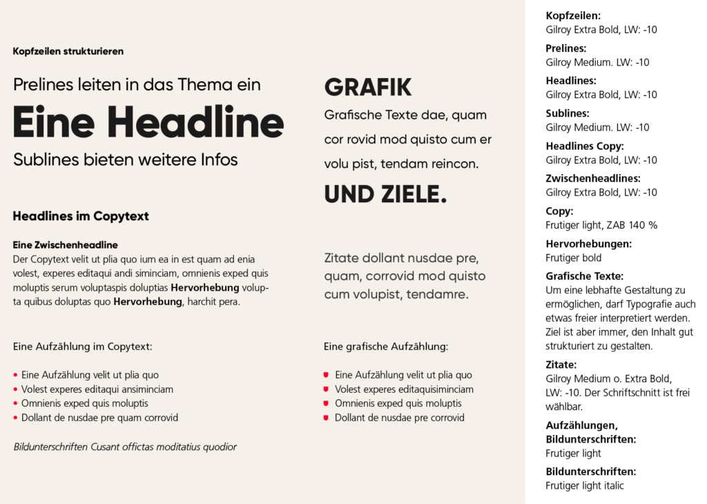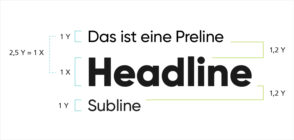 Die hier gezeigten Verhältnismäßigkeiten der Schriftgrößen zueinander sind als Empfehlungen zu verstehen. Je nach Inhalt oder Medium können diese der gewünschten Aussage entsprechend angepasst werden.