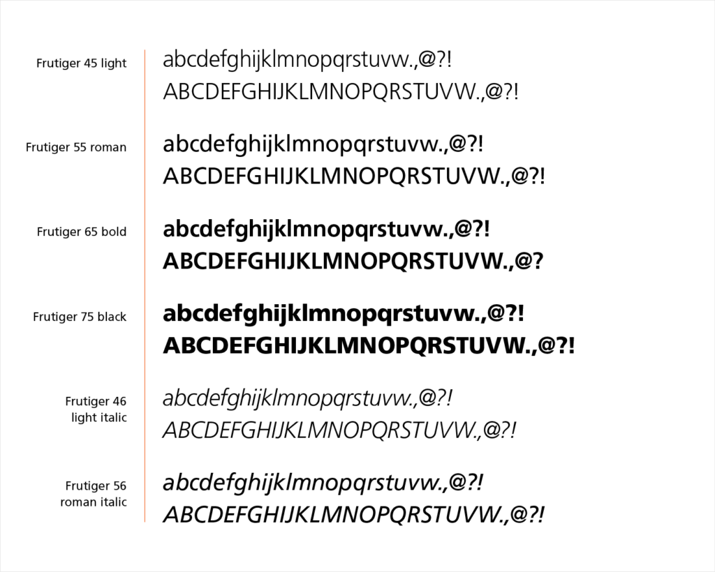Die Frutiger als Hausschrift des Landes Niedersachsen wird als Lauftextschrift, für Bildunterschriften, Bemerkungen und Auszeichnungen eingesetzt. Sechs Schriftschnitte können für die Gestaltung genutzt werden.